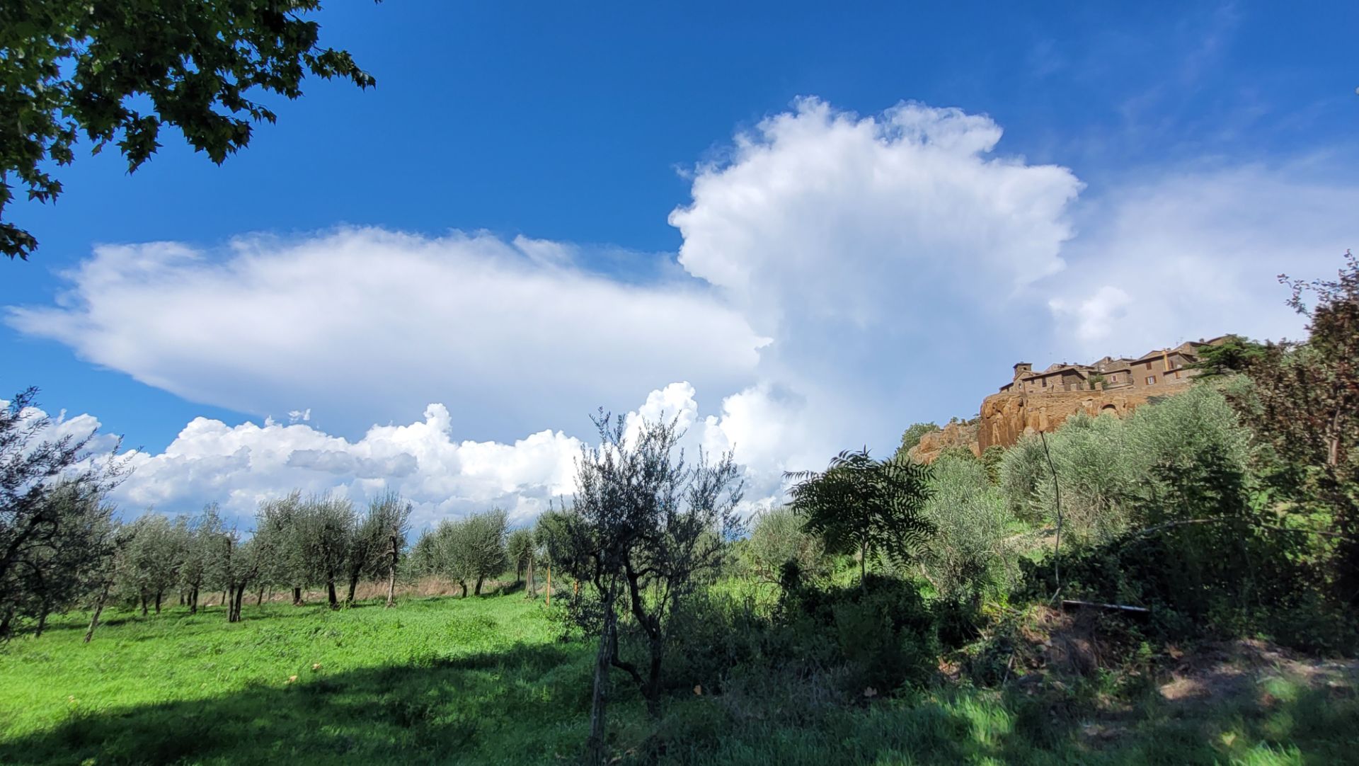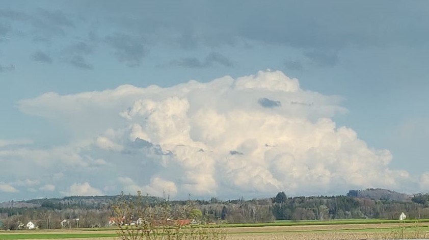 Die Cumulonimbus oder umgangssprachlich auch Gewitterwolken genannt, sind sehr dichte Wolken mit einer hohen vertikalen Ausdehnung, die in ihrer Form einem Turm oder Berg und von der Seite einem Amboss ähneln . Die Unterseite der Cumulonimbus ist eine dunkelgraue bis schwarze Wolkenmasse, darüber befindet sich ein hoher Wolkenturm der je nach Sonneneinstrahlung sowohl hell als auch grau erscheinen kann. Cumulonimben sind stockwerkübergreifende Wolken, die auf eine Höhe von bis zu 13 km heranwachsen können. In einer Cumulonimbus Wolke sind sowohl flüssige als auch vereiste Tröpfchen vertreten, diese sind meist sehr groß, zwischen 4 µm und 200 µm, weshalb auch jeder m³ Wolkenluft meist über 4g Wasser beinhaltet. Eine Cumulonimbus entsteht durch starke Konvektionen bei einer feucht labilen Schichtung. Meist kommt dies an sehr heißen Sommertagen vor, dort entwickeln sich stark ausgeprägte Cumulus Wolken durch Aufwinde zu Cumulonimben. Häufige begleiten Cumulonimben heftige Gewitter, Niederschläge oder Sturmböen. Cumulonimbus Wolken haben zudem verschiedene Sonderformen, die „Böenwalze“, die „mammatus“ und die „Virga“ sind die drei bekanntesten . Die „Böenwalze“ ist eine lange Wolkenwalze, oftmals Sturmböen mit sich bringt, die „mammatus“ ist ein beutelartiges Wolkengebilde an der Unterseite einer Wolke und ist häufig eine Begleiterscheinung eines Gewitters. „Virga“ oder Fallstreifen sind Wolkengebilde, die entstehen, wenn Regen verdunstet, bevor er auf den Boden trifft. Das rechte Bild ist eine Cumulonimbus clavus Wolke die am 22.04.2023 nähe Kempten aufgenommen wurde, dies sind Cumulonimbus Wolken, die bei ihrer Entwicklung nicht bis zur Tropopause vorgedrungen sind und somit nicht die typische Amboss Form besitzen. Die rechte Wolke ist Cumulonimbus capillatus Wolke, diese wurde von StD U. Mayr am 16.09.2022 in Italien aufgenommen, auf dem Bild kann man gut im oberen Bereich der Wolke die fasrige, Amboss artige Struktur von einer typischen Cumulonimbus erkennen.
