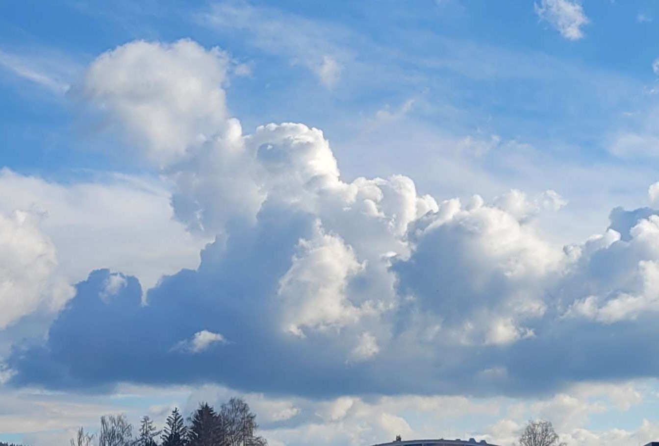 Cumulus Wolken oder umgangssprachlich auch Quell-/Haufenwolken genannt, sind dichte deutlich voneinander abgegrenzte Wolken, die in ihrem vertikalen Erscheinungsbild je nach Ausprägung, die Form eines Hügels, Turms oder einer Kuppel haben. Während der von der Sonne beschienene Teil meist leuchtend weiß erschient, wirkt die vertikal verlaufende Unterseite meist dunkel und schattig. Die Größe der Cumulus Wolke variiert je nachdem zu welcher der drei Unterarten „humilis“, „mediocris“ oder „congestus“ sie angehört. Obwohl Cumulus Wolken teils stockwerkübergreifend sein können, werden sie allgemein zu der Familie der tiefen Wolken gezählt. Cumulus Wolken kommen meist bei Temperaturen über dem Gefrierpunkt vor, weshalb die Töpfchen selten unterkühlt sind. Diese Tröpfchen unterscheiden sich oft in ihrer Größe, je nachdem um welche Unterart es sich handelt, können sie einen Durchmesser von 18 µm bis zu 50 µm haben. Zudem beinhaltet ein m³ Wolkenluft zwischen 1 bis 4 g Wasser. Sie treten meist bei schönem Wetter auf und entstehen durch eine Konvektion, dabei steigt erwärmte Luft auf und kühlt sich, während dem Aufsteigen wieder ab. Je nach Mächtigkeit gehört die dabei entstandene Wolke einer anderen Unterart an, die wiederum auch eine andere Bedeutung für das darauffolgende Wetter hat. Eine Cumulus humilis ist eher flacher als breit .Sie deutet meist auf gutes Wetter hin und entsteht, bei Temperaturen über dem Konden-sationsniveaus. Die linke Abbildung zeigt eine Cumulus humilis vom 09.04.2023 in Kempten, an diesem Tag war die Temperatur in der Höhe von 1500 Metern, morgens bei -1 Grad, im Verlaufe des Tages stieg diese dann, auf 4 Grad an was ideale Bedingungen für eine Cumulus humilis sind. Die Cumulus mediocris ist etwa so hoch wie sie breit ist. Sie ist im vertikalen größer als die Cumulus humilis und kann zusammen mit anderen Haufenwolken zu einem Wolkenmassiv zusammenwachsen. Diese Unterart bildet sich meist bei labiler Schichtung, wenn sie gegen Nachmittag nicht an Größe verliert, weist dies auf eine sich ändernde Wetterlage hin . Die mittlere Abbildung zeigt eine Cumulus mediocris und wurde am 06.05.2023 in der Nähe von Nördlingen aufgenommen. An diesem Tag war das Wetter teils sonnig teils wolkig, diese labile Wetterlage ist eine perfekte Bedingung für die Cumulus mediocris. Die Cumulus congestus ist meist höher als breit. Sie ist eine hohe Quellwolke, die auf bis zu 6 km anwachsen kann und eine Vorform der Cumulonimbus ist. Die Wolke entwickelt sich bei mäßig labiler Schichtung und wenn sie am Abend nicht an Mächtigkeit verliert, sind Veränderungen der Wetterlage und mögliche Gewitter zu erwarten. Die rechte Abbildung zeigt eine Cumulus congestus die am 17.04.2023 aufgenommen wurde. Durch die Temperaturzunahme in Bodennähe kam es zu einer labilen Schichtung, was perfekte Bedingungen für die congestus Wolken sind.